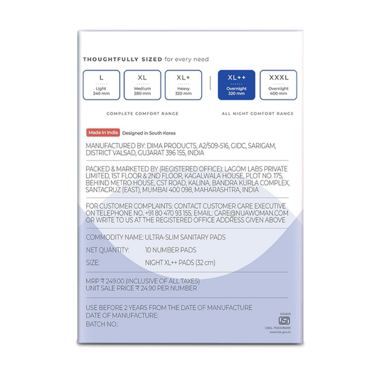 Nua Ultra Overnight Sanitary Pads with Wings – Heavy Flow, Rash-Free, Toxin-Free, 2X Leak Protection, Soft Top Layer for Night Comfort - XL+